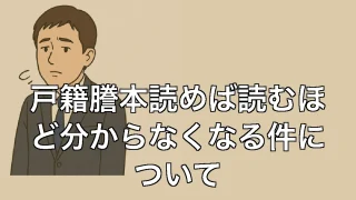 戸籍謄本読めば読むほど分からなくなる件について 戸籍謄本読めば読むほど分からなくなる件について 戸籍謄本読めば読むほど分からなくなる件について 戸籍謄本というやつは、例えるなら「サザエさん一家が三つ巴で養子縁組した上に、波平が四人存在する」くらいの混乱を我々にもたらす。司法書士を十五年や... 2025.08.01