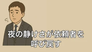 夜の静けさが依頼者を呼び戻す 夜の静けさが依頼者を呼び戻す 夜の静けさが依頼者を呼び戻す 夜に響く依頼者の声 静まり返った事務所で 「カチッ、カチッ」 時計の針の音がやけに大きく聞こえる。事務所の蛍光灯が一つ、じりじりと泣いている。 外は雨。梅雨時の夜は湿度が高く、紙も... 2025.08.01