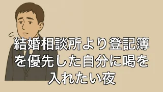 結婚相談所より登記簿を優先した自分に喝を入れたい夜 結婚相談所より登記簿を優先した自分に喝を入れたい夜 結婚相談所のチラシが机に置かれていた朝 ある朝、事務員さんが「先生、これ一応…」と机に置いていったのは、地域の結婚相談所のパンフレットだった。書類の山の中にそれだけが浮いて見えた。「ああ、... 2025.07.30