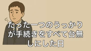 たった一つのうっかりが手続きをすべて台無しにした日 たった一つのうっかりが手続きをすべて台無しにした日 依頼人のうっかりが引き起こした大惨事 先日、ある相続登記の件で、すでに何度もやりとりを重ね、ようやく全書類が整った…はずでした。依頼人のAさんも「これでバッチリです」と言い切っていたので安... 2025.07.02