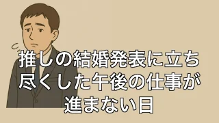 推しの結婚発表に立ち尽くした午後の仕事が進まない日 推しの結婚発表に立ち尽くした午後の仕事が進まない日 推しの結婚は祝福なのか現実逃避なのか 昼下がり、登記完了通知の確認中に、スマホの通知が目に入った。「〇〇さん結婚を発表」。頭が真っ白になった。机に突っ伏すわけにもいかず、PCのカーソルだけ... 2025.06.30