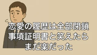 恋愛の履歴は全部閉鎖事項証明書と笑えたらまだ楽だった 恋愛の履歴は全部閉鎖事項証明書と笑えたらまだ楽だった 恋愛と無縁だった司法書士という肩書の孤独 司法書士という肩書は、世間的には「しっかりしてそう」とか「堅実そう」とか思われることが多い。でも実際は、机に向かって黙々と登記と書類に向き合う毎... 2025.06.30