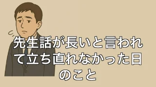 先生話が長いと言われて立ち直れなかった日のこと 先生話が長いと言われて立ち直れなかった日のこと なぜあの日の一言がここまで刺さったのか 「先生、話が長いんですよね」──この一言を言われた日、正直、立ち直れませんでした。事務所の空気が一瞬止まり、顔が熱くなったのを覚えています。冗談交じりで... 2025.06.30