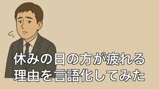 休みの日の方が疲れる理由を言語化してみた 休みの日の方が疲れる理由を言語化してみた 休日なのに全然休めた気がしない 「せっかくの休みなのに、なぜか疲れが取れない」。そんなふうに感じたことはありませんか?僕はほぼ毎週そうです。平日は予定が詰まっていて大変なのに、休日になった途端、心も... 2025.06.30