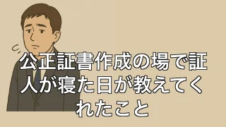 公正証書作成の場で証人が寝た日が教えてくれたこと 公正証書作成の場で証人が寝た日が教えてくれたこと あの日の静かな午後に起きたこと 公正証書の作成に立ち会う日は、たいてい緊張感が漂う。依頼者もこちらも、それなりに気を引き締めて臨む。だが、あの日は違った。午後の陽射しが窓から差し込み、室内に... 2025.06.30