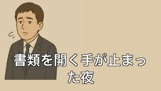 書類を開く手が止まった夜 書類を開く手が止まった夜 一枚の書類に心が折れることもある たった一枚の書類。それが、どうしてこんなにも重たく感じるのか。業務としては何度も処理してきた形式的な登記の書類。けれど、その夜は違った。目の前に広げたA4の紙が、まるで心の中のモヤ... 2025.06.30