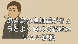 焼き鳥の塩加減がちょうどよく感じる夜はだいたい孤独 焼き鳥の塩加減がちょうどよく感じる夜はだいたい孤独 一人焼き鳥の夜にふと思うこと 「焼き鳥でも食って帰るか」。そんな独り言を、帰りのコンビニの前で無意識につぶやいていた。今日は少し早く事務所を出られた。といっても20時前。誰も待っていない部... 2025.06.30