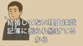 結婚してない理由は登記簿に振られ続けてるから 結婚してない理由は登記簿に振られ続けてるから 独身の理由を聞かれて登記簿と答える日々 「どうして結婚しないの?」と聞かれるたびに、少し笑って「登記簿が忙しくて」と答えるのが自分の中での定番になっている。冗談まじりに言っているつもりだが、心の... 2025.06.30