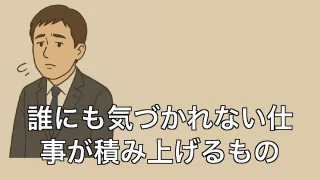 誰にも気づかれない仕事が積み上げるもの 誰にも気づかれない仕事が積み上げるもの 気づかれない仕事に意味はあるのかと問いたくなる日 朝から晩までこなしているこの仕事、果たして誰かが見てくれているのだろうか——。そんな疑問が頭をよぎるのは、一日が終わって誰もいない事務所で椅子にもたれ... 2025.06.30