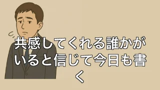 共感してくれる誰かがいると信じて今日も書く 共感してくれる誰かがいると信じて今日も書く 一人きりの事務所でこぼれる本音 朝のうちはそれなりにやる気もあるのに、午後になると不思議と沈んでくる。電話も来客も落ち着いた時間帯。ふと気づけば、部屋の静けさに押しつぶされそうになっている自分がい... 2025.06.30