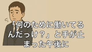 「何のために働いてるんだっけ?」と手が止まった午後に 「何のために働いてるんだっけ?」と手が止まった午後に ふと立ち止まってしまう日がある 朝からずっと仕事に追われて、気がつけばもう夕方。書類の山を前にしたまま、手が止まってしまう瞬間がある。外はまだ明るいけれど、頭の中はもやがかかったように重... 2025.06.26