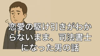 恋愛の駆け引きがわからないまま、司法書士になった男の話 恋愛の駆け引きがわからないまま、司法書士になった男の話 駆け引きできない人生と、司法書士という職業 恋愛において「駆け引きが大事だ」と言われたことがある。でも正直、それが何なのか今でもよくわからない。連絡を返すタイミングを計る?わざと冷たく... 2025.06.26