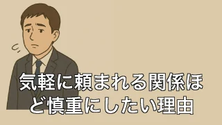 気軽に頼まれる関係ほど慎重にしたい理由 気軽に頼まれる関係ほど慎重にしたい理由 気軽に声をかけられることが増えたけれど 司法書士として長年働いていると、「ちょっと教えて」「これってどう思う?」と気軽に声をかけられる場面が増えていく。人間関係が深まり、信頼されているのはありがたい…... 2025.06.26