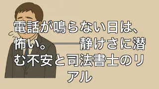 電話が鳴らない日は、怖い。──静けさに潜む不安と司法書士のリアル 電話が鳴らない日は、怖い。──静けさに潜む不安と司法書士のリアル 電話が鳴らない日は、怖い。──静けさに潜む不安と司法書士のリアル 鳴らない電話が怖くなる日がある 静かな日。それがかつては「ありがたいな」と思えていた。だが今は違う。朝から何... 2025.06.25