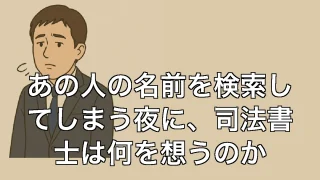 あの人の名前を検索してしまう夜に、司法書士は何を想うのか あの人の名前を検索してしまう夜に、司法書士は何を想うのか 誰にも言えない夜の癖 ふと仕事が終わって、事務所の灯りを落としたあと、なぜか検索バーに「昔好きだった人」の名前を打ち込んでしまう。これは、誰にも言えない夜の癖だ。別に何かを期待してい... 2025.06.25