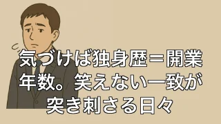 気づけば独身歴=開業年数。笑えない一致が突き刺さる日々 気づけば独身歴=開業年数。笑えない一致が突き刺さる日々 独身歴と開業年数が並ぶカレンダー ある日、何気なく事務所の開業届を出した年を思い出し、「あれ?これって…」と気づいてしまった。開業してからずっと独身で、気づけばその年数が完全に一致して... 2025.06.25