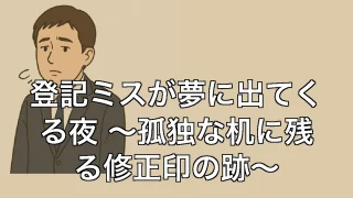 登記ミスが夢に出てくる夜 〜孤独な机に残る修正印の跡〜 登記ミスが夢に出てくる夜 〜孤独な机に残る修正印の跡〜 またミスか…夢の中でも訂正印を押していた 「あ、またやってしまった」そんな夢を見て目が覚めた朝は、決まって寝汗でシャツが張り付いている。司法書士という仕事は、派手さはないが責任だけは重... 2025.06.25