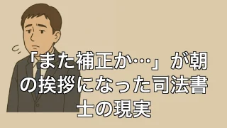 「また補正か…」が朝の挨拶になった司法書士の現実 「また補正か…」が朝の挨拶になった司法書士の現実 朝イチの法務局メール、それは「補正のご案内」 毎朝、机に向かって最初に開くのが法務局からのメールになって久しい。眠気まなこでモニターを見つめながら、件名に「ご案内」と書かれていたら、それはも... 2025.06.25