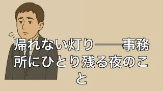 帰れない灯り──事務所にひとり残る夜のこと 帰れない灯り──事務所にひとり残る夜のこと 誰もいない事務所に、なぜかまだ灯りがついている 夜9時を過ぎても、僕の事務所の灯りはついたままだ。周囲の建物はとっくに暗くなっていて、事務所の窓から漏れる光が、まるで「ここだけはまだ終わっていない... 2025.06.25