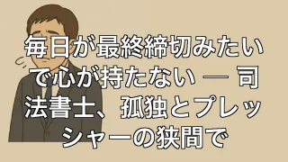 毎日が最終締切みたいで心が持たない ─ 司法書士、孤独とプレッシャーの狭間で 毎日が最終締切みたいで心が持たない ─ 司法書士、孤独とプレッシャーの狭間で 朝から心拍数が上がってる 司法書士という仕事をしていると、朝の目覚めと同時に心拍数が上がる日がある。いや、正確に言えば「毎日がそう」だ。目覚ましが鳴るより前に、夢... 2025.06.25