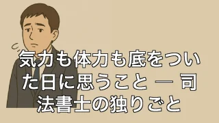気力も体力も底をついた日に思うこと ― 司法書士の独りごと 気力も体力も底をついた日に思うこと ― 司法書士の独りごと 朝起きた瞬間からもうしんどい 朝のアラームが鳴っても、体がまったく動かない日がある。何かの病気かと思うくらい重たくて、目は覚めているのに、まぶたを開けるのも苦痛。頭の中で「今日はや... 2025.06.25
