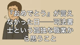 『おめでとう』が言えなかった日──司法書士という孤独な職業から思うこと 『おめでとう』が言えなかった日──司法書士という孤独な職業から思うこと 「お祝いの言葉」が喉の奥に引っかかる日がある 「おめでとう」と言えばいいのに、言葉が喉の奥に引っかかって出てこない。そんな日がある。誰かの昇進、結婚、出産…自分でも祝っ... 2025.06.23