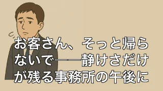 お客さん、そっと帰らないで――静けさだけが残る事務所の午後に お客さん、そっと帰らないで――静けさだけが残る事務所の午後に 気づいたら、椅子が空いていた 午後の静けさが落ち着くはずなのに、今日はなぜか落ち着かなかった。いつも通りの業務。書類の確認、登記の準備、事務員とのちょっとしたやり取り。ふと気がつ... 2025.06.23