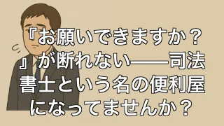 『お願いできますか?』が断れない——司法書士という名の便利屋になってませんか? 『お願いできますか?』が断れない——司法書士という名の便利屋になってませんか? 『ちょっとだけお願いできますか?』が仕事を増やす魔法の言葉 「ちょっとだけでいいんで、お願いできますか?」——この一言に、私は何度うなずいてきただろう。簡単なこ... 2025.06.23