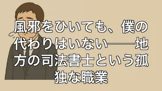 風邪をひいても、僕の代わりはいない──地方の司法書士という孤独な職業 風邪をひいても、僕の代わりはいない──地方の司法書士という孤独な職業 休めない現実と壊れていく心身 地方の司法書士という仕事は、たった一人で回しているようなものだ。事務員が一人いるとはいえ、責任の重さや判断の最終的なところはすべて自分にのし... 2025.06.23