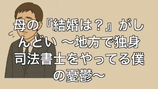母の『結婚は?』がしんどい ~地方で独身司法書士をやってる僕の憂鬱~ 母の『結婚は?』がしんどい ~地方で独身司法書士をやってる僕の憂鬱~ 母の「結婚は?」攻撃、また来たか…という朝 朝の静けさを破るように鳴るスマホの着信音。発信元は「実家」。この表示だけで、なんだか胃がキュッと縮こまる。たいがい体調か天気の... 2025.06.23