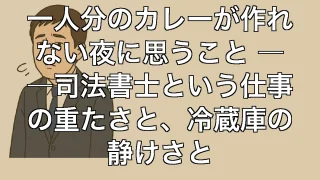 一人分のカレーが作れない夜に思うこと ――司法書士という仕事の重たさと、冷蔵庫の静けさと 一人分のカレーが作れない夜に思うこと ――司法書士という仕事の重たさと、冷蔵庫の静けさと カレーすら作れない夜に、ふと考えること 夜の9時を過ぎて、ふと「カレーが食べたいな」と思う。冷蔵庫には玉ねぎがひとつ、じゃがいももある。ルウも残ってる... 2025.06.23