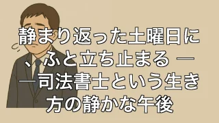 静まり返った土曜日に、ふと立ち止まる ――司法書士という生き方の静かな午後 静まり返った土曜日に、ふと立ち止まる ――司法書士という生き方の静かな午後 誰もいない土曜日の午後、やけに耳が敏感になる 土曜日の午後、事務所の中はしんと静まり返っている。平日はあれだけ鳴っていた電話も止まり、ドアの開閉音もない。事務員は「... 2025.06.23