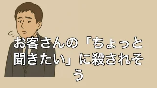 お客さんの「ちょっと聞きたい」に殺されそう お客さんの「ちょっと聞きたい」に殺されそう 「ちょっと聞きたい」は本当に“ちょっと”なのか 「先生、ちょっと聞きたいんですけど」――この言葉を何度聞いたことか。電話越しに、訪問先で、LINEでも。何気ない導入に見えるが、実際にはその“ちょっ... 2025.06.23