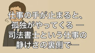 仕事の手が止まると、孤独がやってくる ―司法書士という仕事の静けさの裏側で― 仕事の手が止まると、孤独がやってくる ―司法書士という仕事の静けさの裏側で― 静かな時間に忍び寄るもの 日中、事務所の電話が鳴らないと、ふと不安になります。今までは「静かでいいや」と思っていたのに、なぜか今日は違う。人の気配がない、話し声も... 2025.06.23