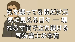 気を張ってる間だけ元気に見える日々 ― 壊れる寸前で立ち続ける司法書士の本音 気を張ってる間だけ元気に見える日々 ― 壊れる寸前で立ち続ける司法書士の本音 気を張っている間は元気に見えるけど、それって元気なのか? 「元気そうだね」と言われることがあります。でも、そのたびに内心で「いや、そう見えてるだけだよ」とつぶやき... 2025.06.23