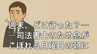 週末、どこ行った?――司法書士のため息がこぼれる月曜日の朝に 週末、どこ行った?――司法書士のため息がこぼれる月曜日の朝に 土曜の朝は、自由の香りがした 土曜の朝は、なぜあんなに優しいのか。平日とは明らかに違う空気が流れていて、朝の光でさえ柔らかく見える。いつもより少し遅く起きて、目覚ましの音に起こさ... 2025.06.23