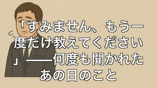 「すみません、もう一度だけ教えてください」——何度も聞かれたあの日のこと 「すみません、もう一度だけ教えてください」——何度も聞かれたあの日のこと あの日、何度も「すみません」と言われた ある日の午後、事務員さんに業務の流れを説明していた。何度も説明したはずの登記の進行手順だったけれど、彼女の表情はどこか不安げで... 2025.06.20